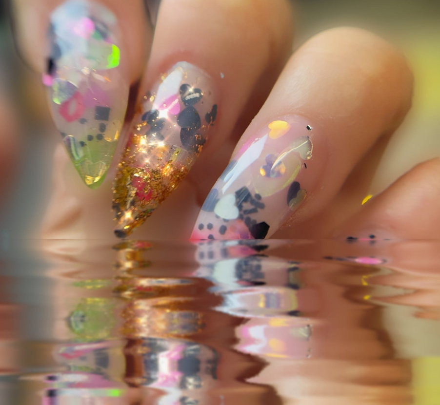 A bespoke luxury nail service crafted with clean, non-toxic premium polygel. Each set features delicately encapsulated designer elements—sparkles, dried florals, pigments, and metallic flakes—layered seamlessly within the nail for a sophisticated, glass-like finish.
